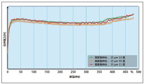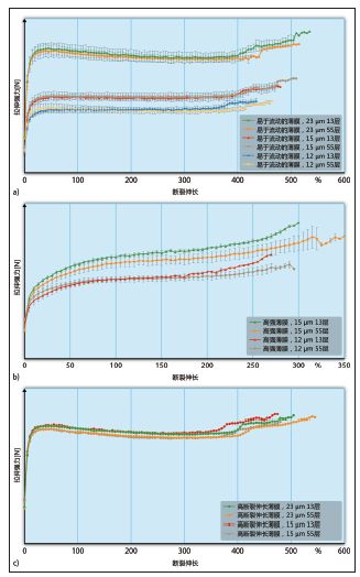 比較極限測(cè)試程序記錄的拉伸強(qiáng)力和斷裂伸長(zhǎng)率, 可以得到相似的結(jié)果。在13、55層薄膜生產(chǎn)線的“極限曲線”中,比較了一種厚度、一種配方的易于流動(dòng)薄膜(圖6a)和強(qiáng)力薄膜。