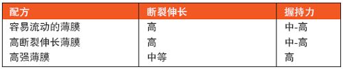 厚度如圖所示,幅寬為500mm的收縮膜采用同樣的工藝參數(shù)進(jìn)行加工。配方中的拉伸和握持力有差異,以反映商業(yè)用途的需要(表1)。陶氏聚乙烯薄膜如Elite AT 6111(采用Elite AT技術(shù)加工成的乙烯-辛烯共聚物)滿足了高性能薄膜的要求。