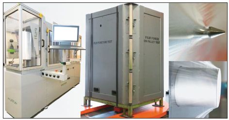 比利時(shí)Deerlijk的ESTL 公司的FPT-750薄膜測(cè)試系統(tǒng)被用于測(cè)試薄膜(圖5)。按照不同的預(yù)拉伸、測(cè)試速度,測(cè)試了可能的最大預(yù)拉伸斷裂伸長(zhǎng)、穿刺和抗震性能。選用了常規(guī)的4000 mm/s包覆速度。